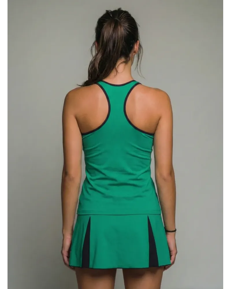 Camiseta COSSI en verde, un top sin mangas de estética limpia y muy actual, diseño deportivo con espalda tipo racerback que libera hombros y escápulas para golpear, subir a la red y girar con total comodidad, corte favorecedor que acompaña el cuerpo sin resultar opresivo, tejido técnico ligero, transpirable y de secado rápido pensado para entrenamientos y partidos, tirantes cómodos y sisas bien diseñadas para evitar roces, una prenda versátil que combina perfecto con blanco, negro o estampados para un look fresco y potente, fabricada en España