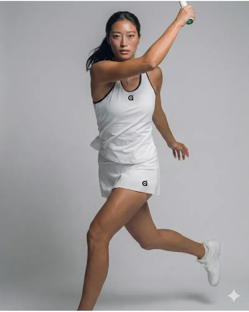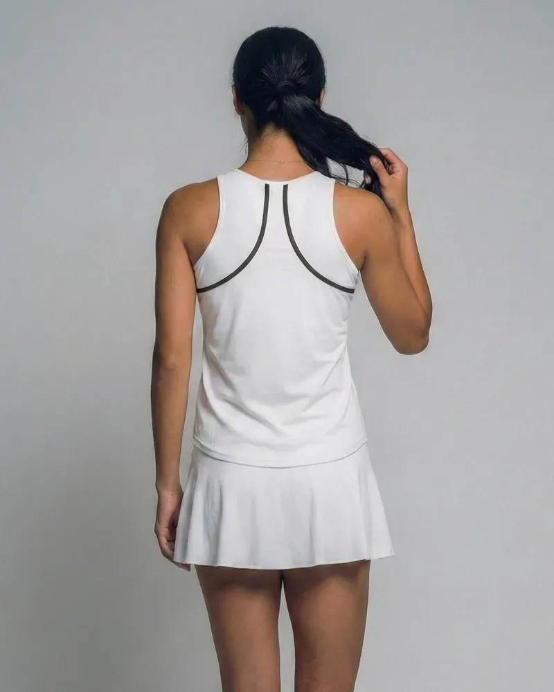 Top técnico premium en blanco, sin mangas y de corte suelto, ligero y transpirable, diseñado para pádel y tenis con una silueta limpia y muy favorecedora