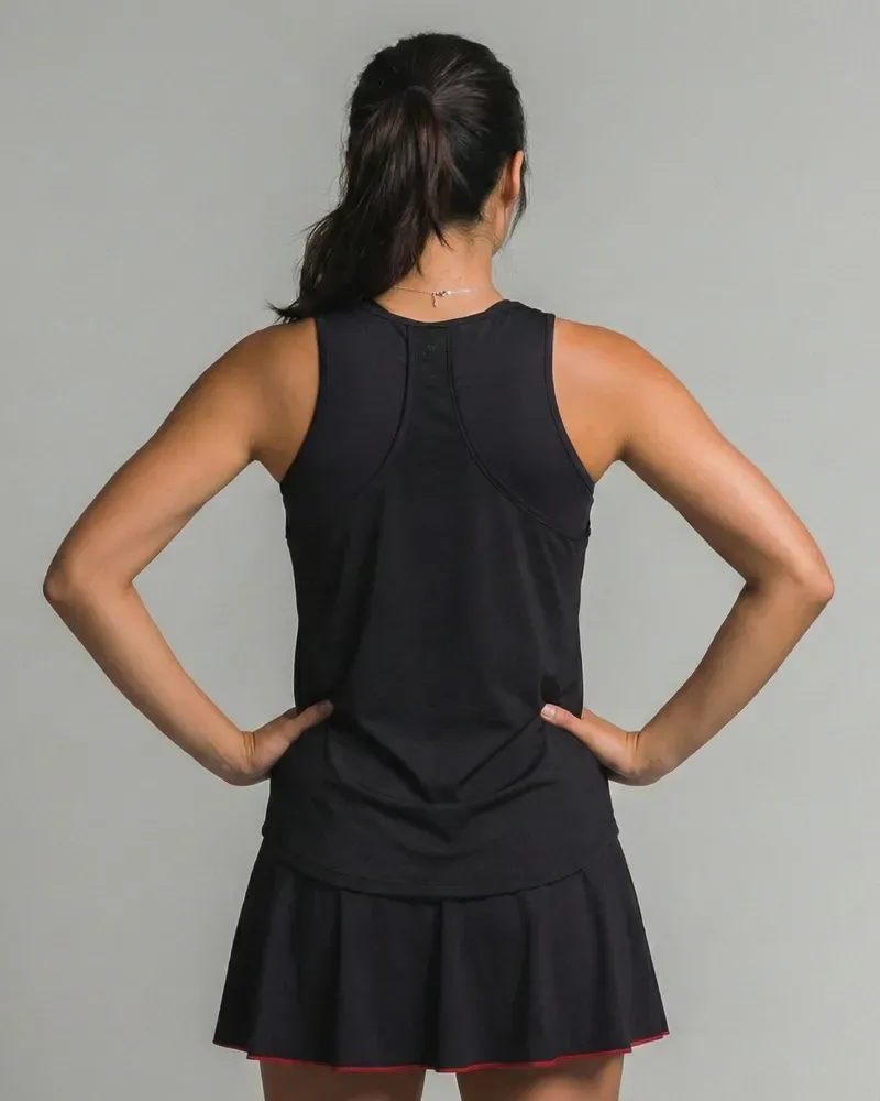 Premium technical black sleeveless top with a relaxed fit, lightweight and breathable, designed for padel and tennis with a clean flattering silhouette