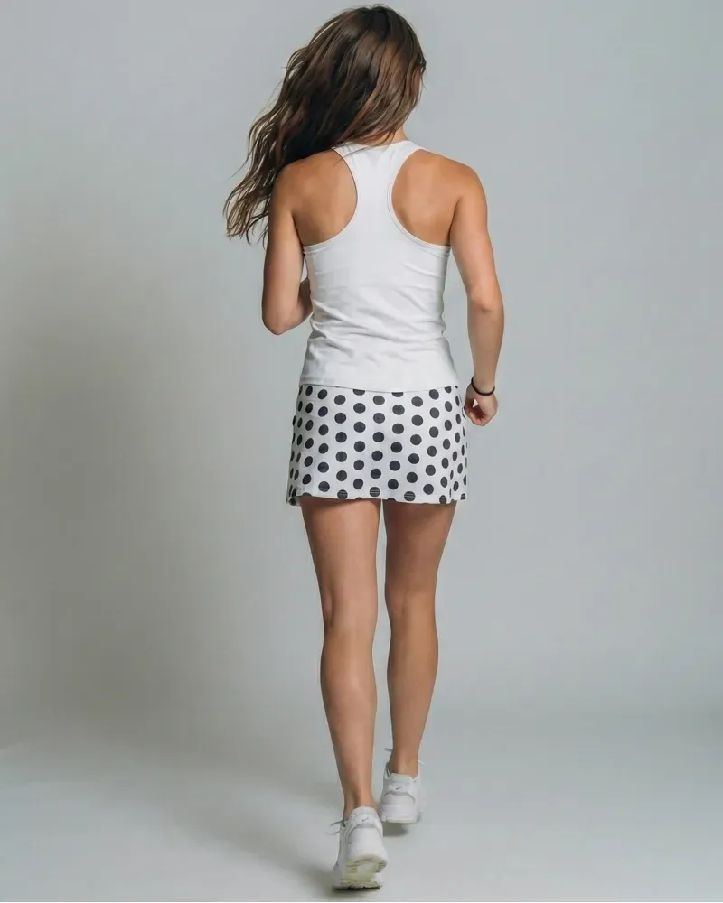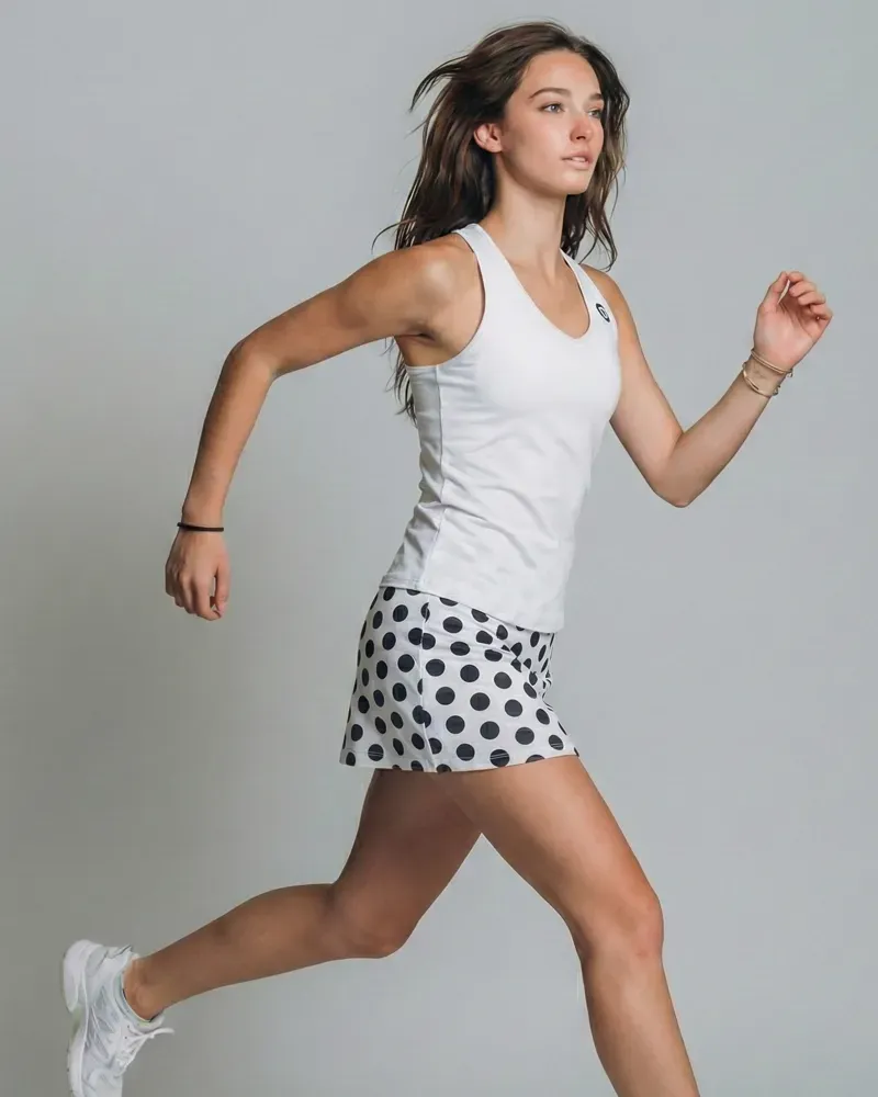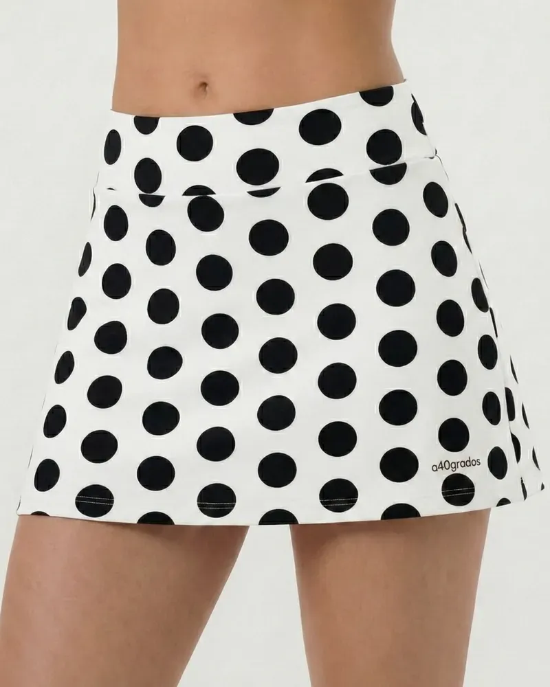 Women’s padel and tennis skirt in a Lunar Black/White print. Fluid drape that moves naturally with you. Built-in white inner shorts for confidence and comfort during play. Practical inner pocket for a ball or small essentials. Comfortable waistband that stays in place without digging in. Breathable quick-dry fabric for training and match days. Composition 92% Meryl polyamide and 8% elastane. Clean premium finish, easy to pair with tops and tanks from the collection. Made in Spain